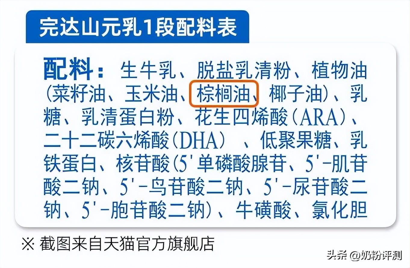 原料方面需要注意的是,完达山元乳前三段数都没有添加香精、蔗糖、麦芽糊精等成分,但是完达山元乳系列在1段中含有棕榈油。